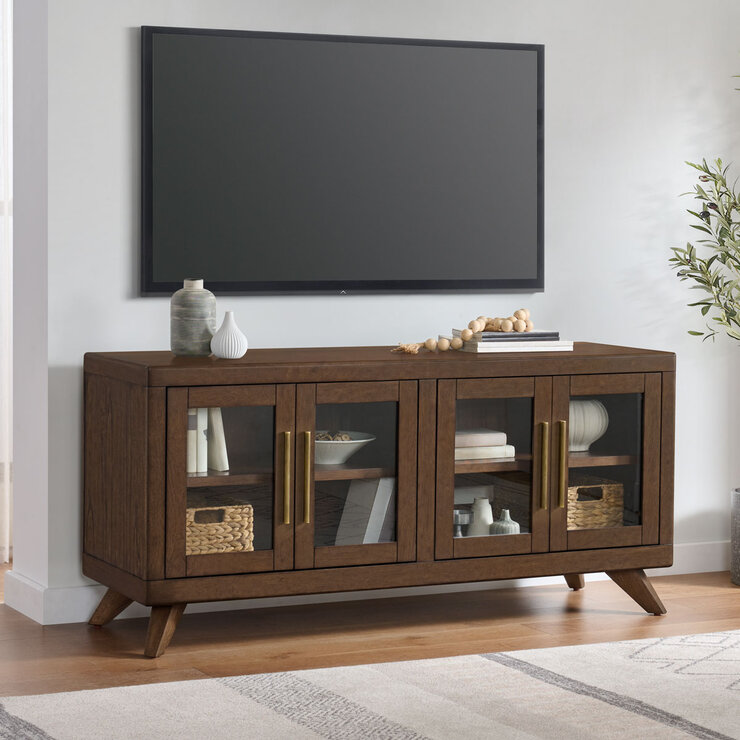 Entertain in style with the Wimberly Entertainment Unit. Wimberly is not only stylish, but also highly functional, completed in a multi-step modern walnut finish that will make a tremendous addition to your home. It features ample storage inside with versatile adjustable shelves. Customise the look to your taste with the interchangeable two door and two handle options. You can use an all wood door look, change these to glass, or have a combination of both to fit your needs as well as choosing between gold or brushed gold handles. Completed with solid wood legs, Wimberly is timeless as well as durable.